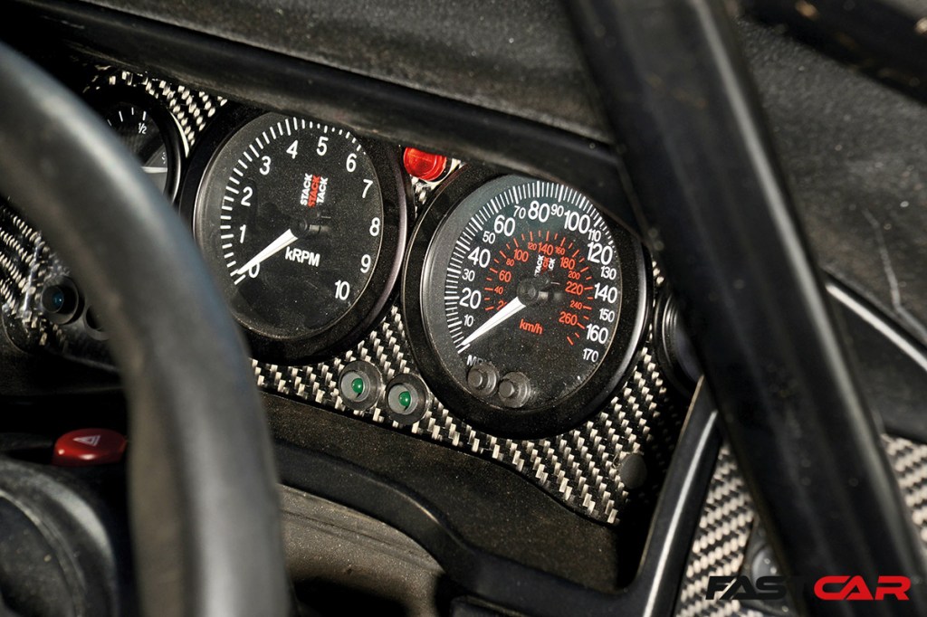 With that noticeable increase in power all sent to the rear wheels, the T5 gearbox now benefits from hardened internals and an Alcon 6-paddle clutch, while a combination of Compbrake 6-pot calipers with 330mm rotors up front and 4×4 calipers with 300mm vented discs on the rear greatly improve stopping power. “When the car was first built for motorsport, it received a welded-in multi-point rollcage, triangulated from the struts to the rear diff,” Mark says. “I never planned on taking this out, though it was tricky to repaint it by hand!” Retaining the cage also meant that installing the flocked dash took more time and effort than he’d hoped too! Aside from that troublesome cage and a dash that’s a nightmare to keep clean, the remainder of the cabin is a lightweight motorsport-themed affair as you’d expect, with carbon doorcards, Sparco seats, Stack gauges and a GPS speedo all present.