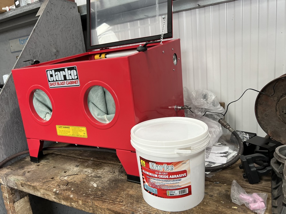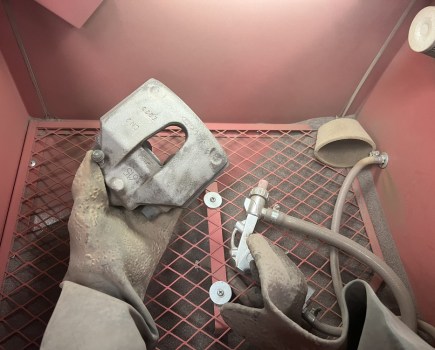 It’s over to the blast cabinet. Make sure you blank off the union where the brake flexi is attached to avoid grit getting inside the caliper. After a few minutes, all that corrosion is blasted away back to bare metal