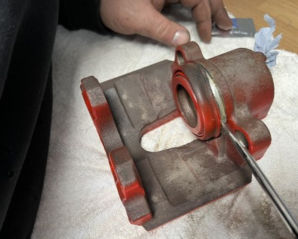 Using a small pick tool, remove the old rubber piston seal from within the caliper.